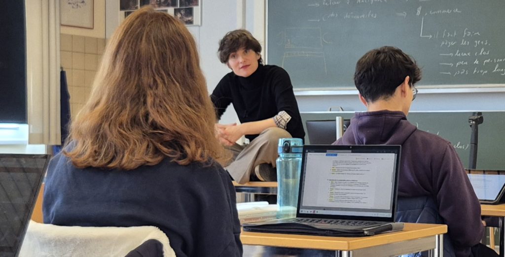 Le mercredi 19 novembre, 5 jours après avoir assisté à une représentation scolaire du Misanthrope, au Théâtre des Osses, la classe a eu le privilège d’un bel échange avec Anne Schwaller, la metteuse en scène. Rassurés par la très bonne lisibilité du spectacle, les élèves ont sans difficulté embarqué dans l’univers de cette stimulante mise en scène. Attentifs à bien des détails, et interpelés par plusieurs des propositions, ils ont pu, grâce à la bienveillante disponibilité de Mme Schwaller, revenir sur divers aspects de ce spectacle.