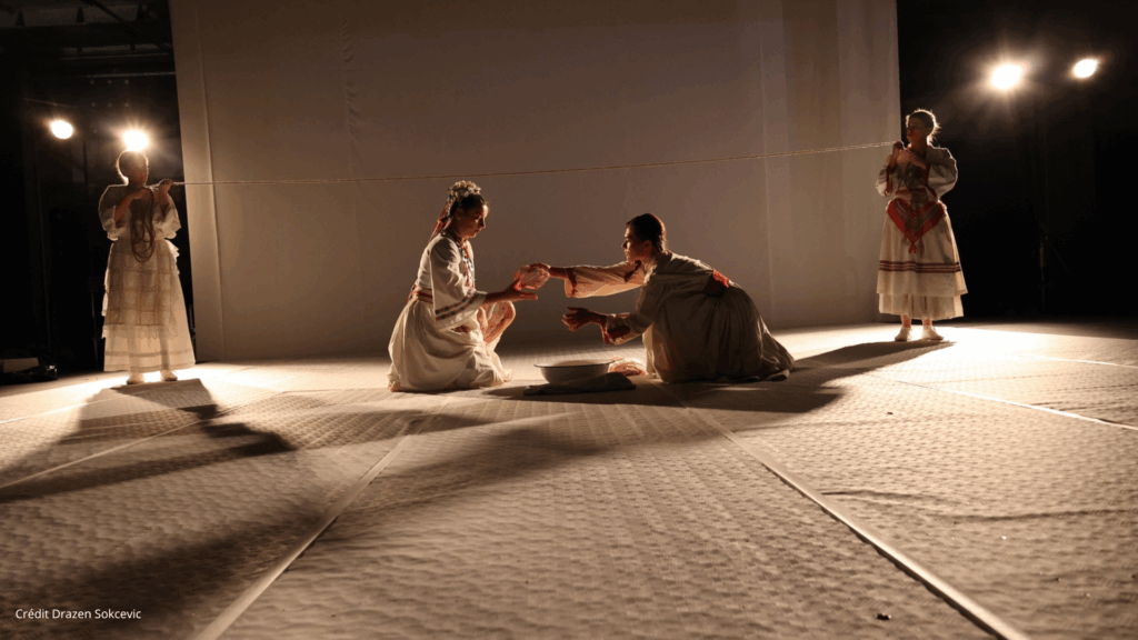 Dans cette pièce, la dimension sonore est majeure, avec des musiques qui reviennent, comme des musiques traditionnelles croates ou, au contraire, des musiques modernes qui soulignent le contraste entre le propos moderne et les décors et costumes plus traditionnels. Les comédiennes nous parlent avec leurs voix naturelles, ce qui rend toute la pièce plus intime. Nous avons particulièrement aimé le fait que les actrices brisent aussi le 4ème mur et commencent la pièce en rendant le public attentif au « son » de la ville. À tout cela s’ajoutent les interviews des différentes femmes dont on apprend les histoires par la diffusion dans toute la salle.